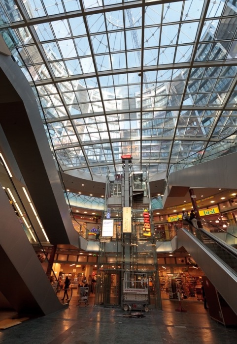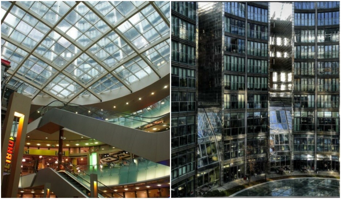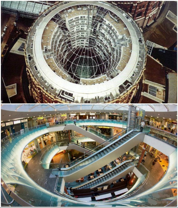 Обилие стекла и зеркальных поверхностей – любимый прием в оформлении интерьеров от французского архитектора Жана Нувеля (Венские газгольдеры, Австрия). | Фото: 22sobaki.livejournal.com/ berlogos.ru.Чтобы превратить столь специфический объект в полноценный комплекс, дизайнерам, архитекторам и инженерам пришлось немало потрудиться. Так, например, газгольдер под литерой А преображал Жан Нувель – большой любитель «игры» со светом и тенью. Учитывая его склонность интерпретировать все на свой вкус, не стало удивлением то, что интерьер нескольких шопинг-зон, фантастический атриум, стеклянный купол, общие зоны отдыха и огромные холлы выполнены из зеркальных или сверкающих материалов.