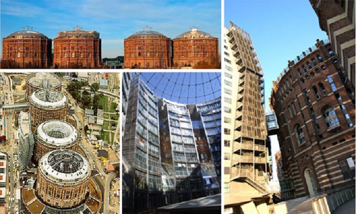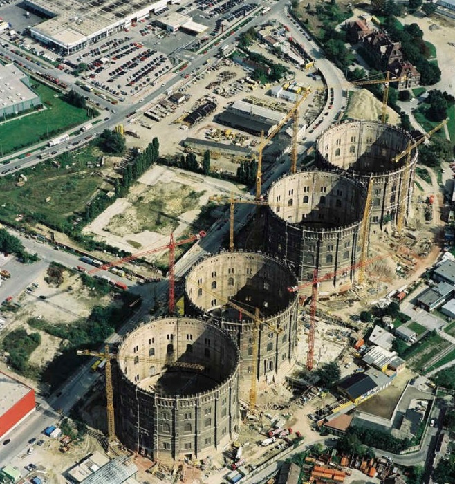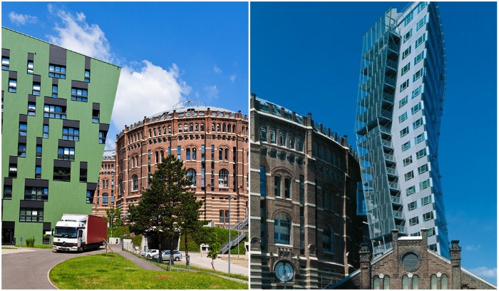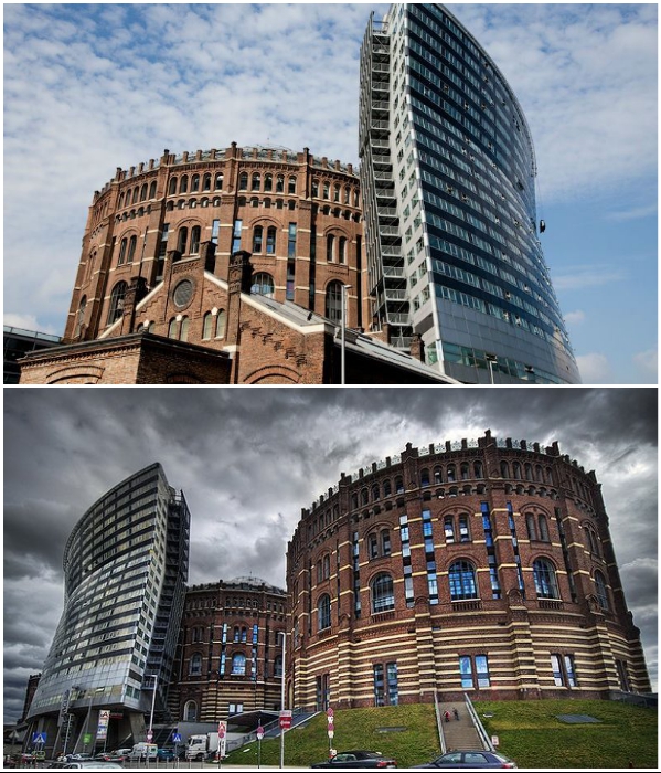 Вокруг старинных газометров появились ультрасовременные здания (Вена, Австрия). | Фото: venagid.ru/ progulkipo.blogspot.com.В итоге, конкурс выиграло сразу 4 архитектурных фирмы: австрийское архитектурное бюро «Coop Himmelblau», а также студии архитекторов Манфреда Ведорна, Вильгельма Хольцбауэра и всемирно известное бюро Жана Нувеля — неординарного французского архитектора, лауреата Притцкеровской премии. Вот поэтому их наполнение и исполнение концептов кардинально разнятся.
