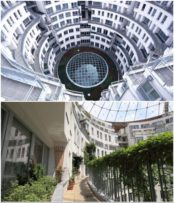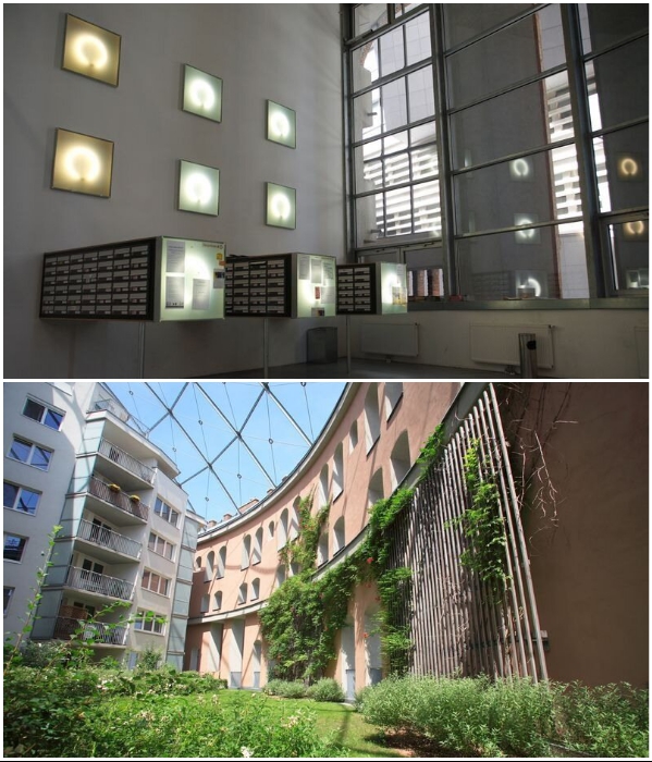 В развлекательной зоне сохранили элементы индустриального стиля (Венские газгольдеры, Австрия). | Фото: 22sobaki.livejournal.com.Трансформацией третьего хранилища занимался архитектор Манфред Ведорн со своей командой. Этот объект оказался уютным зеленым двориком жилого комплекса, вокруг которого каскадом разместили квартиры. Такое расположение обеспечивает максимальный доступ солнечного света и создает особенный оазис семейного дома, ведь нижние этажи занимают детский сад, школа и различные медицинские учреждения.