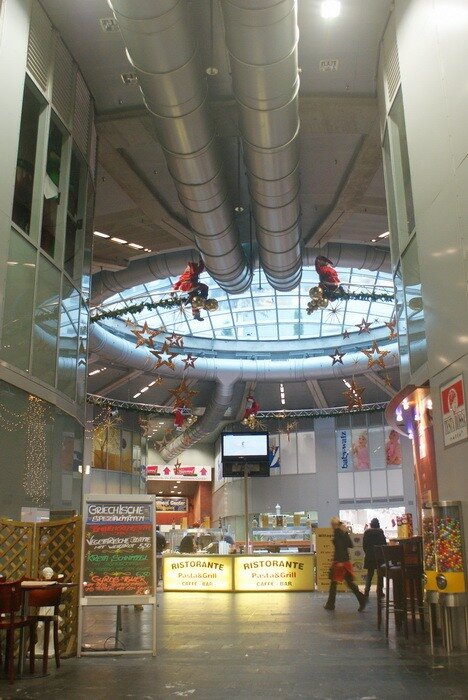 Торговый центр внутри газгольдера (Вена, Австрия). | Фото: one-in.livejournal.com.В ходе полной реконструкции внутреннего пространства все 4 сооружения с нумерацией латинскими буквами A, B, C и D превратились в многофункциональные объекты, в каждом из которых есть деловая, жилая и развлекательная зоны. Под жилье (около 800 квартир и одно общежитие, рассчитанное на 250 студентов) выделили верхнюю часть газометров, офисы и общегородские службы находятся на средних уровнях, а вот магазинам, барам, ресторанам, клубам, кинотеатру и огромному концертному залу, рассчитанному сразу на 3,5 тысячи зрителей, достались нижние этажи.