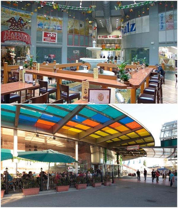 Бары, рестораны и кафе есть не только внутри обновленного комплекса, но и на прилегающей территории (Венские газгольдеры, Австрия). | Фото: one-in.livejournal.com.Четвертый реорганизованный объект под литерой D стал детищем архитектора Вильгельма Хольцбауэра. В нем разместились не только жилые апартаменты, но и государственный архив, бесчисленные магазинчики и общие зоны отдыха. Интересной особенностью этого газгольдера стало то, что нижние ярусы отделены стеклянной крышей, по краям которой высажены настоящие сады. Так что жильцы, чьи квартиры находятся внутри хранилища, могут наслаждаться природой.К счастью, старинные заброшенные сооружения вдохновляют современников на неожиданные трансформации, даже если это инженерное сооружение или обычная хозпостройка. Им приходится вкладывать немало сил и средств, чтобы очередной памятник архитектуры обрел новую, яркую жизнь.