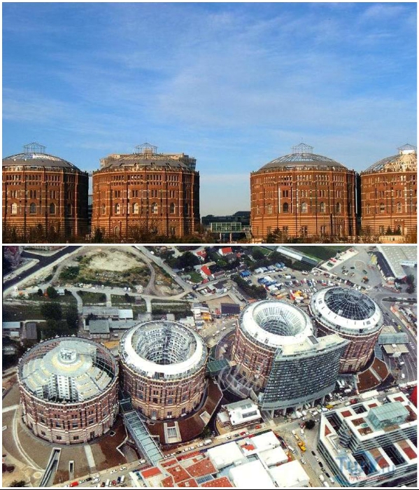 Венские газометры — впечатляющее напоминание о прошлом и оригинально воплощенное будущее (Австрия). | Фото: dnevnik.bigmir.net/ ru.wikipedia.org.Газгольдеры или, как еще их называют газометры, расположенные в Вене, были построены в 1896–1899 гг. Эти гигантские газовые хранилища играли основную роль в обогреве зданий и освещения улиц столицы Австрии вплоть до 1984 г.