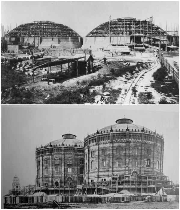 Самые крупные газгольдеры Европы были построены в районе Зиммеринг между 1896–1899 гг. (Вена, Австрия). | Фото: ru.esosedi.org/ berlogos.ru.Интересный факт: В конце XIX века эти 4 инженерных объекта считались крупнейшими в Европе. Их высота 70 м, а в диаметре круглые по форме газометры достигают 60 м.