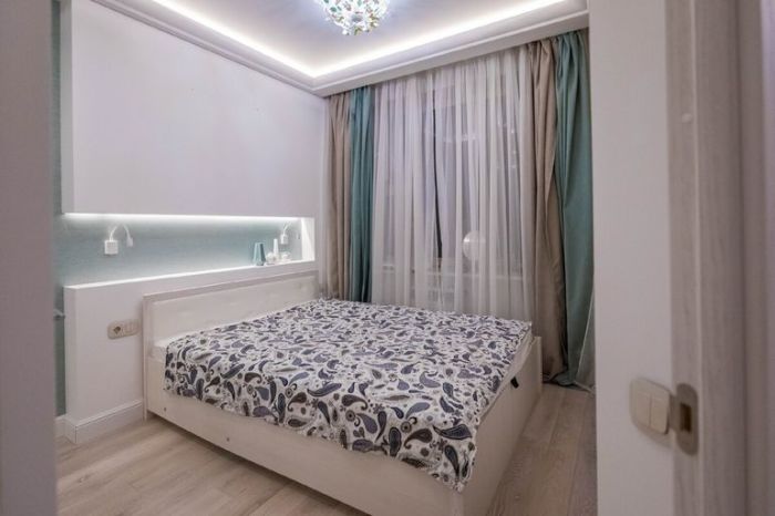 Текстиль и оформление интерьера соответствует цветовой гамме дизайна всей квартиры. | Фото: onashem.mediasole.ru.Для спальни осталось совсем мало места, поэтому пришлось отказаться от прикроватных тумбочек, но их недостаток компенсировали за счет создания декоративной надстройки у изголовья. Ее сделали из двух частей, поэтому получилась ниша с полочкой для необходимых мелочей и дополнительных мини-светильников, хотя верхняя часть короба также подсвечена с нижней части.