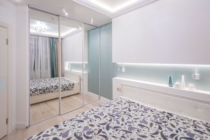 Оригинальное и функциональное оформление акцентной стены у изголовья. | Фото: onashem.mediasole.ru.Благодаря большому окну и установленному шкафу-купе с зеркальными раздвижными дверями, комната наполнилась светом и визуально стала больше. Этому поспособствовал грамотный выбор цветовой гаммы текстиля и оформления стен, ведь квартиру стремились сделать просторной за счет использования нейтральных и спокойных цветов, наличия глянцевых и зеркальных поверхностей, а также используя материалы различной фактуры.Перенаселенность мегаполисов заставляет застройщиков уменьшать количество квадратных метров квартир, ведь свободных площадей уже не осталось, а народу прибывает. Поэтому дизайнеры и сами владельцы стараются обустроить свое жилище максимально рационально, чтобы комфорт не пострадал и было приятно находиться в нем. А как это сделать правильно, быстро и с наименьшими затратами можно узнать из следующего материала.