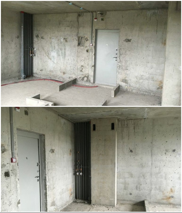Квартира была приобретена в черновой отделке. | Фото: onashem.mediasole.ru.Справка: «Евродвушка» - это по сути однокомнатная квартира, в которой есть отдельная спальня и большая комната, объединенная с кухней – гостиная-кухня. Если рассматривать в процентном соотношении, то основная комната будет иметь 30-40% площади, остальные же «квадраты» пойдут на организацию ванной, туалета и спальни, а вот узкого коридора (частенько абсолютно бесполезного!) уже не будет. В эконом-вариантах подобное жилье значительно меньше полноценной двухкомнатной квартиры (а значит дешевле), но больше, чем современные однокомнатные.
