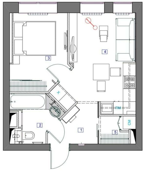 План-чертеж квартиры с распределением зон и установкой перегородок. | Фото: onashem.mediasole.ru.Для того, что разместить все необходимые зоны, требуется тщательный анализ и грамотная планировка. Имея довольно неплохую геометрию самой квартиры и наличие сразу трех окон, без особых проблем удалось определиться с расположением основных жилых зон. Для того, чтобы избежать создания дополнительного коридора, но при этом обособить спальню, перегородку, разделяющую сразу 4 зоны, поставили по диагонали.