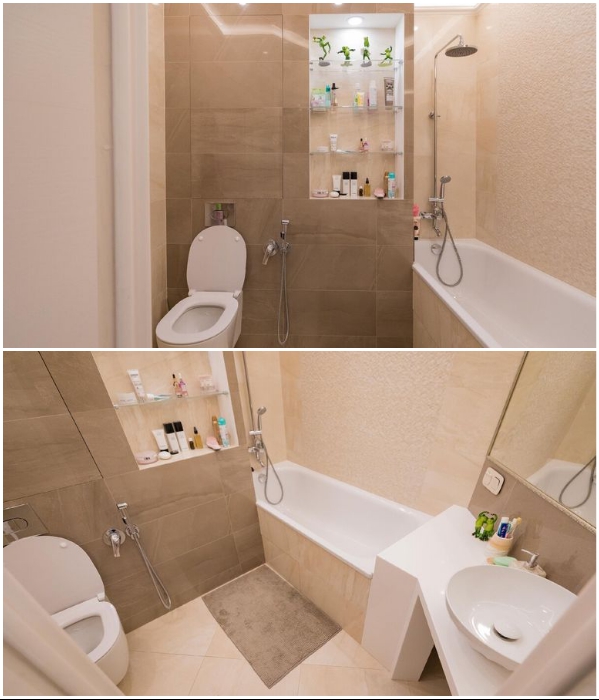 Наглядное подтверждение того, что диагональное расположения перегородки помогает увеличить площадь. | Фото: hit.miformat.info.Поскольку расположение ванной комнаты было предусмотрено генеральным планом дома, то менять ничего не стали, да и по закону это запрещено. Громоздкие коммуникации пришлось спрятать за коробом, который облицевали не привычной глянцевой плиткой, а декоративной штукатуркой. Она специальный раствор, который хорошо переносит перепад температур и влагу, не образовывая отслоек или распространения плесени. Такая же отделка повторилась и вдоль стены, где установили полноценную ванну, а вот экран, закрывающий ее нижнюю часть, сделан из керамической плитки, которой покрыли пол. Чтобы придать объема этой комнате, помимо большого зеркала над рукомойником, был установлен вместительный шкаф для банных принадлежностей с глянцевыми фасадами дверей. В общем же, дизайнеру удалось создать расслабляющую и умиротворенную обстановку, грамотно используя бело-песочные тона отделки, мебели и сантехнического оборудования.