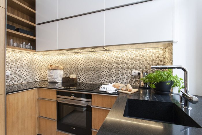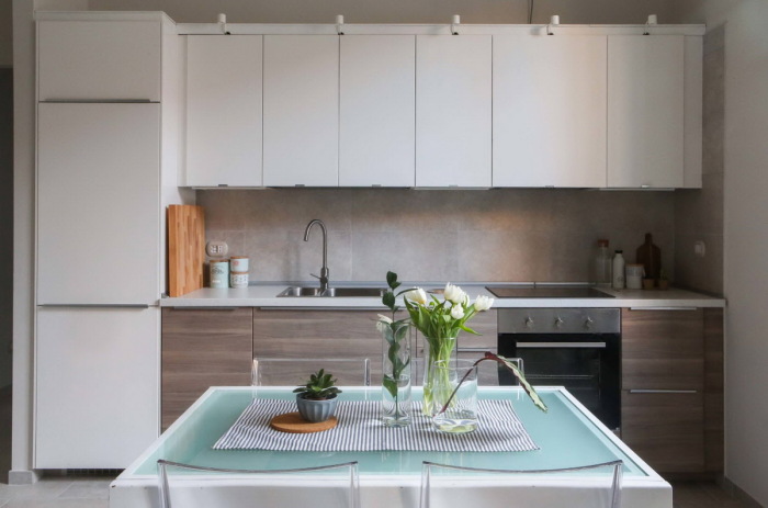 Купите очень маленький кухонный гарнитур, фартук сделайте из стекла, откажитесь от дополнительных модулей. Маленькая кухня всегда стоит дешевле большой, не правда ли? Сделайте столовую на одного, если вы действительно живете один, или на двоих, а не на четверых «с запасом на гостей». Купите двухконфорочную варочную панель, небольшой холодильник, маленькую раковину. Все это выйдет дешевле.