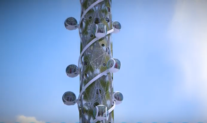 В зависимости от высоты здания, длительность поездки на обзорном лифте будет составлять от 3 до 10 минут (концепт «Spiral Tower»). | Фото: youtube.com/ © NorthernLight.Поскольку еще никак не могут определиться, какой же высоты будет сам небоскреб, получивший название «Spiral Tower», то количество пассажирских кабин может колебаться от 4 до 16. Естественно они будут управляться интеллектуальными системами, впрочем, и все, что находится внутри здания или за его пределами (окна с виртуальными изображениями, уход за вертикальным садом, расход ресуров и т.д.).