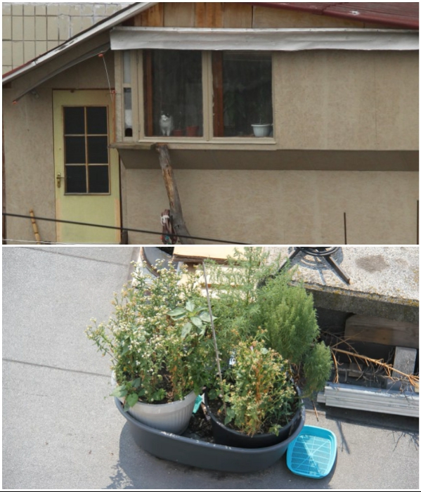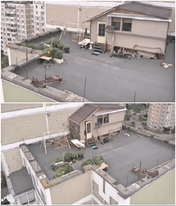 Крыша этой многоэтажки стала идеальным местом для разведения цветов, отдыха на свежем воздухе и прогулок кота! | Фото: youtube.com/ © Украина.РУ.Для того, чтобы наслаждаться открывающейся городской панорамой, был сделан «дворик» с зоной отдыха со столом и лавками, а также установили садовые качели. Теперь семья может обедать или ужинать на свежем воздухе и даже принимать гостей. Заботливый хозяин успел пристроить сарайчик для инструмента, натянул веревки для сушки белья. На данный момент приготовлены столбики для создания забора, чтобы оградить «свой участок» на крыше. Это если и незаконно, но все-таки разумно, учитывая, что высота довольно приличная и такие прогулки не всегда могут оказаться безопасными. Ведь на «дачу» являются гости с детьми и собственные внуки.