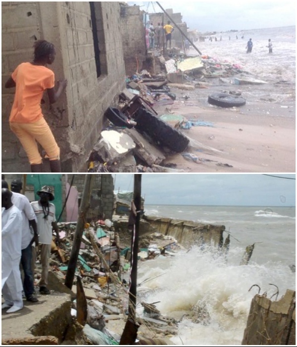 Угроза наводнения прибрежных районов возрастает с каждым днем (Saint Louis, Сенегал). | Фото: chroniques.sn/ news.africahotnews.com.В добавок к этой напасти, во время сильных штормов многие рыбацкие деревеньки, теперь уже острова, оказались полностью под водами Атлантики. Так, например, рыбацкий район Гет-Н'дар (Guet N’dar) был полностью накрыт 4-метровой волной в сентябре 2017 года. В одну ночь Атлантический океан поглотил 100 домов, школу, мечеть и часть кладбища. Благо, что в нем проживали рыбаки, которые по вторичным признакам распознали надвигающую беду и успели вывести всех жителей в безопасное место. Бездомных поместили в импровизированный лагерь рядом с аэропортом, в котором они обитают до сих пор. Даже несмотря на то, что океан со временем частично отступил, после себя он оставил полную разруху.
