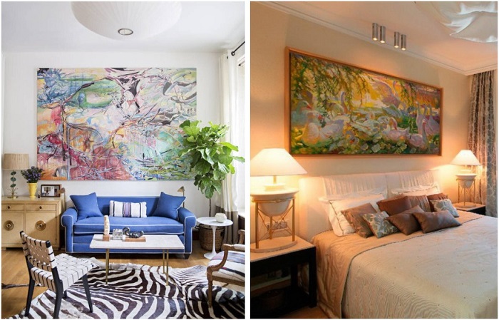 Вокруг картины на стене должно оставаться свободное местоКартина в духе «Черного квадрата» Малевича, морской пейзаж, который является живым воплощением природы и источником вдохновения, винтажный постер, изображение Мэрилин Монро в стиле поп-арт – можно выбрать что угодно. Самое главное, чтобы полотно вас восхищало, вдохновляло и хорошо вписывалось в имеющийся интерьер. И не забывайте о размере – чем больше картина, тем лучше.После того, как вы повесите ее в выбранной комнате, то сразу увидите, насколько сильно изменилось помещение. Яркое крупное полотно разбавит приевшийся интерьер, станет замечательным акцентом и будет привлекать взгляды всех гостей. Кроме того, этот предмет декора станет отличной возможностью для самообразования: наблюдение за одной и той же картиной на протяжении многих недель и месяцев откроет новые горизонты, смыслы и покажет, как меняетесь вы сами, ваше мышление и взгляды на жизнь.Обратите внимание: При выборе размера полотна учитывайте, что когда вы повесите картину на стену, вокруг нее должно быть достаточно свободного места. Искусство любит пространство, поэтому со всех сторон должны быть отступы, будто произведение обрамляет еще одна рама. А вот плотно прижимать картину к шкафу, полкам или дивану – плохая идея.