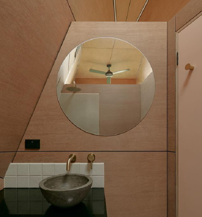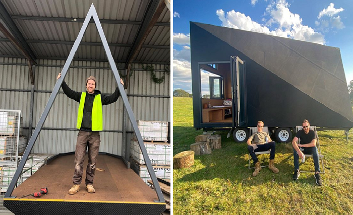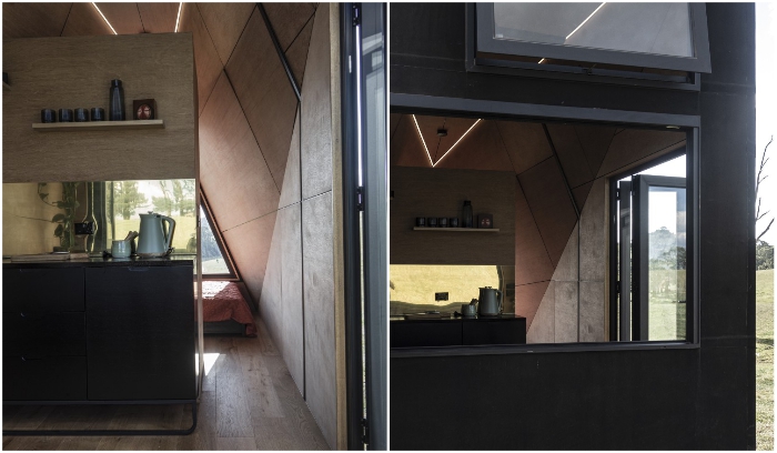 А-образная конструкция домика намного практичней и экономичней («Base Cabin», Мельбурн). | Фото: dezeen.com.Хотя в реальной жизни подобная конструкция каркаса оказалась довольно практичной и экономичной, позволяющей организовать сразу 3 комнаты на площади всего лишь 15 кв. м. Поскольку этот мобильный домик имеет классическую А-образную каркасную форму, то на его создание ушло намного меньше стройматериалов, чем для стандартного сооружения прямоугольной формы.