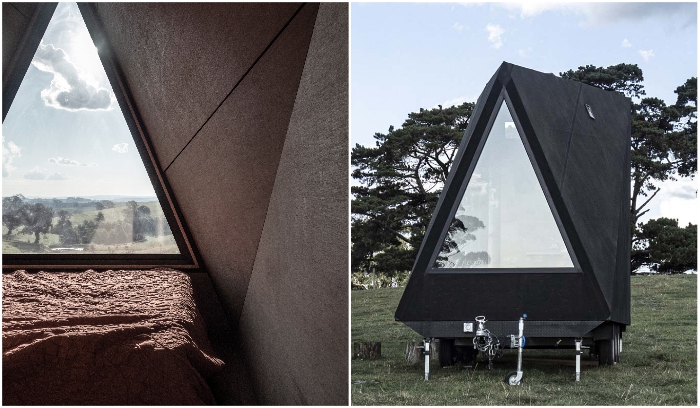 Спальная зона расположена у треугольного окна в конце микро-домика на колесах («Base Cabin», Мельбурн). | Фото: dezeen.com/ newatlas.com.Несмотря на то, что для спальни выделено совсем крошечное пространство, но огромное треугольное окно и двуспальная кровать вполне компенсируют маленькие габариты.