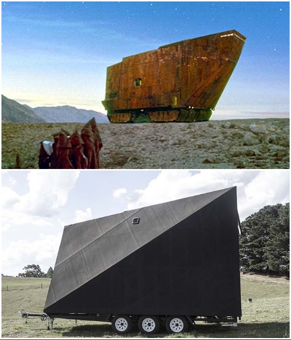 Австралийцы создали микро-дом на колесах очень похожий на инопланетный транспорт из «Звездных войн» («Base Cabin», Мельбурн). | Фото: vinegred.ru/ fundesign.tv.Увлечение автомобильным туризмом (караванингом) уже не одно десятилетие подталкивает любителей кочевой жизни к созданию оригинальных моделей домов на колесах. Уже дошло до того, что эти мини-коттеджи используются в качестве постоянного места жительства. На такие кардинальные изменения условий быта многих толкает непомерная дороговизна недвижимости и заоблачная арендная плата, другие же просто увлечены путешествиями и жизнь в постоянном движении их больше вдохновляет и удовлетворяет.