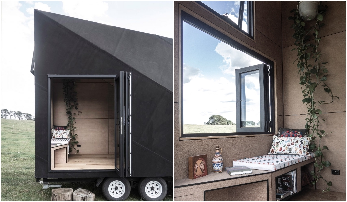 Сразу у входа в домик расположена оригинальная гостиная («Base Cabin», Мельбурн). | Фото: dezeen.com/ newatlas.com.Благодаря щедрому остеклению жилые зоны получились довольно объемными и светлыми. Это вдобавок позволяет экономить на электроэнергии и отоплении в межсезонье. Оригинальности и света добавляют и полностью стеклянные двустворчатые двери, которые складываются гармошкой для экономии места. Прямо с порога владельцы или гости столь необычных апартаментов попадают в гостиную, диванчик в которой сделан в виде широкого подоконника с вместительным коробом под сиденьем. Расположение у большого распашного окна позволяет использовать это место и для отдыха, и для чтения, и для того, чтобы любоваться открывающимся пейзажем, ради которого люди отправляются в путешествия.