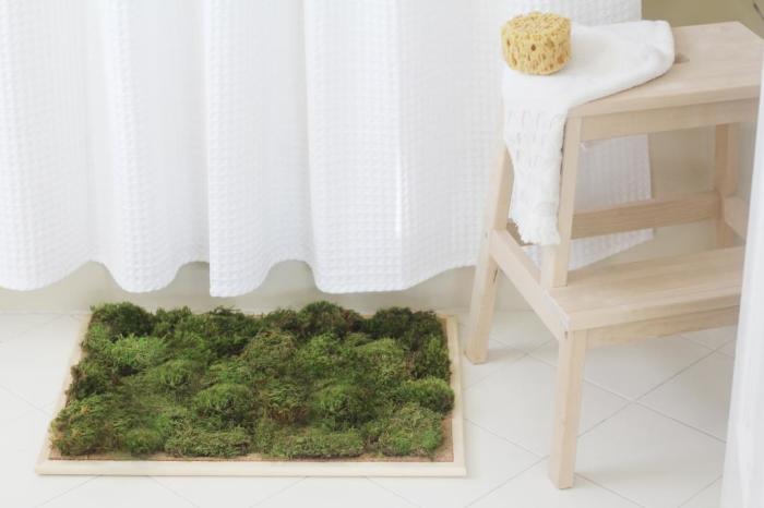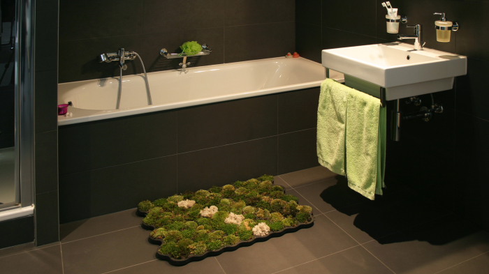 Зеленый цвет отлично разбавит однотонный интерьер комнаты. /Фото: nastroy.netКоврик из мха — это не только красиво и оригинально, но еще и очень полезно. Постелив такой в ванной комнате, можно каждый день наслаждаться приятным микромассажем ног, который будет улучшать кровообращение и ток лимфы. Да и самому коврику в комнате с повышенным уровнем влажности будет комфортнее, чем в каком-либо другом помещении. Особенно сильно такое дополнение придется по вкусу тем, кто любит прогулки босиком по мягкой травке или мху.