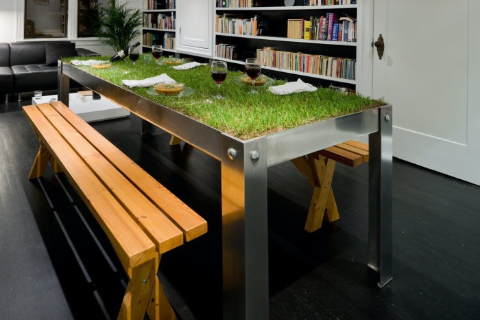 С таким оригинальным столом можно представить, что ты обедаешь на природе, как на пикнике, только с большим комфортом. /Фото: archinect.imgix.netДаже в тесном помещении можно почувствовать себя будто на пикнике. Ожившие столы с настоящей травой, которая растет по всей поверхности столешницы или в ее центре — это удивительная возможность объединиться с природой и во время трапезы почувствовать больше свободы, естественности и красоты. Насыщенный зеленый цвет сочной травы способствует активизации сил, улучшению аппетита и генерации интересных идей, поэтому этот дизайнерский ход отлично подойдет как для офиса, так и собственного жилья. Подобный оригинальный прием можно использовать не только для столов, но и кухонных столешниц или подоконников.