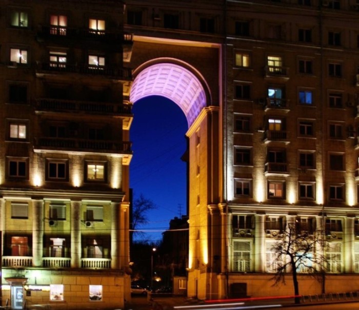 Причиной появления арки стали архитектурные веяния того времени / Фото: mperspektiva.ruРеальные причины появления такой конструкции гораздо проще. Вероятнее всего, архитекторы поступали в соответствии с веяниями архитектурной моды того времени. А тогда в тренде было визуальное создание эффекта простора. Массивные сталинки, которые располагались слишком близко одна к другой, как бы сжимали пространство. Создавалась иллюзия тоннеля. Портал же его как бы расширял. Сама арка тоже декорирована, хотя это и не бросается особо в глаза. На ее своде присутствуют элементы, напоминающие кессоны квадратной формы, а с боков сделали небольшие окошки.