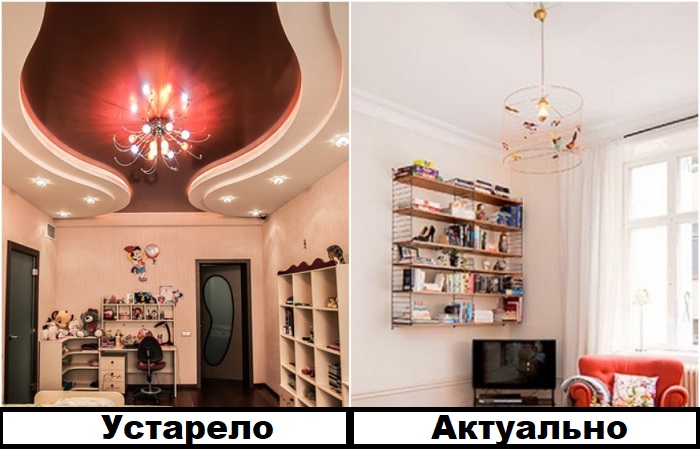 Многоуровневые натяжные потолки утяжеляют пространствоВ некоторых квартирах можно увидеть блестящие натяжные потолки с огромным рисунком и множеством точечных светильников, расположенных по периметру. Лет пять-десять назад такой потолок вызывал восторг и буквально перехватывал дыхание, ведь выглядел очень богато и презентабельно. Однако сегодня дизайнеры придерживаются другого мнения: подобная конструкция очень давит и утяжеляет пространство, особенно если в квартире низкие потолки (хрущевки – лишнее тому доказательство). Натяжные многоуровневые конструкции можно использовать лишь в том случае, если вы преследуете техническую цель. Мы говорим о разводке вентиляции и иных коммуникаций, организации конструкции для встраивания и так далее.Если же подобной необходимости нет, отдайте предпочтение простым, лаконичным потолкам без всевозможных излишеств. Для примера можете взглянуть на скандинавские интерьеры – там потолки аккуратные, без сложного декора, с ярким освещением, но без помпезных люстр. В большинстве случае используются гладкие матовые поверхности, которые отличаются правильными геометрическими формами. Идеально ровные потолки делаются однотонными, а в качестве оформления могут использоваться разве что деревянные панели или балки.