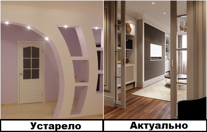 Гипсокартонные конструкции занимают много местаГипсокартонные перегородки с нишами, оснащенные внутренне подсветкой, фигурные фальшстенки, художественные арки, выстроенные в узких коридорах – все это устарело. Подобные конструкции пришли к нам из 2000-х и, к сожалению, не торопятся покидать современные квартиры. Их главный минус заключается в том, что они занимают много места и «съедают» все пространство, особенно если речь идет о малогабаритных квартирах. Кроме того, в 2020 году в моде просторные светлые комнаты, а архитектурные излишества в виде ниш, арок только загромождают пространство.Современные дизайнеры предпочитают использовать для зонирования «ажурные конструкции», к которым относятся вертикальные деревянные балки, тонкие металлические панели, выполненные при помощи художественной резки. Также в моде до сих пор ширмы и стеклянные перегородки, которые добавляют пространству легкости.