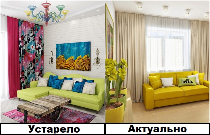 Сочетание большого количества ярких цветов в интерьере смотрится некрасивоЯрко-желтые диваны, зеленый шкаф, розовые фоторамки, бирюзовые подушки – еще несколько лет назад такая любовь к цвету считалось очень актуальной и современной. Подобный коктейль сам по себе выглядел очень оригинально, взрывая сознание, а помещенный на светлый фон, превращался в декорацию-манифест нового поколения.Некоторые дизайнеры называли эти смелые решения поп-артом, добавляя в интерьеры постеры с изображением Мэрилин Монро, и дизайнерскую мебель кислотных оттенков. Однако позже жители квартир, оформленных в подобном стиле, уставали от яркого цвета. Одно дело, когда вы находитесь в такой обстановке раз в месяц, например, когда приходите на вечеринку, а совсем другое, когда вам приходится жить в этой «радужной» атмосфере и лицезреть ее ежедневно. Поэтому предлагаем поберечь свои нервы и зрение, отказавшись от моды на неоновые цвета.Обратите внимание: Гораздо гармоничнее смотрятся нейтральные оттенки (белый, серый, бежевый, нежно-голубой), которые можно разбавить яркими акцентами (диванными подушками, полками, шторами).