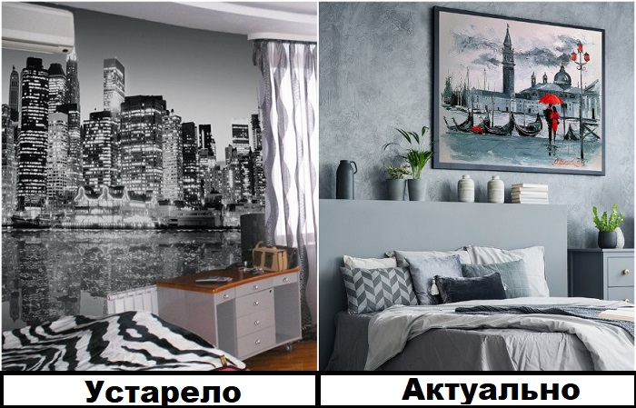 Вместо фотообоев лучше использовать картиныНа протяжении последних пяти-семи лет было очень популярно использовать фотообои с изображением мировых столиц. Логичность и уместность подобного дизайнерского решения долго не оспаривалась, так как черно-белые снимки всегда выглядят стильно и элегантно, а небоскребы Манхэттена покоряют своей красотой. Кроме того, подобные обои делают пространство визуально больше, становятся акцентом в комнате и прекрасно сочетаются с упомянутыми выше яркими оттенками.Наверное, именно поэтому черно-белые фотообои быстро стали популярными и начали появляться даже в студенческих общежитиях. Но такая доступность не всегда играет на руку, особенно если ваша цель – оформить действительно интересный интерьер, который бы характеризовал вас как личность и не встречался в каждой второй квартире. Сломайте шаблон и вместо небоскребов повесьте на стену фотографию Венеции, например, но нормального размера в красивой рамке.