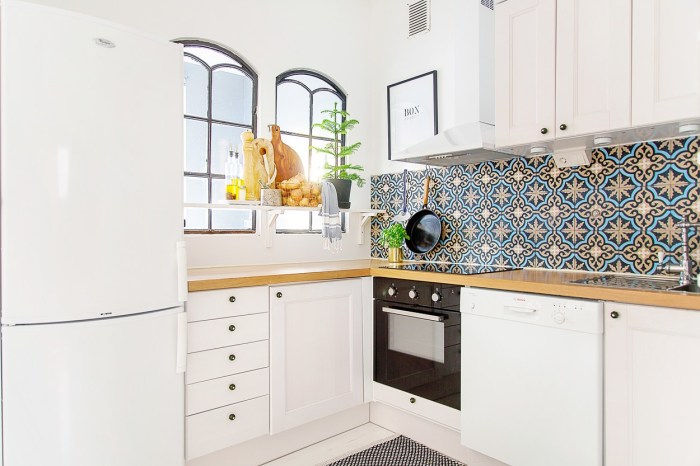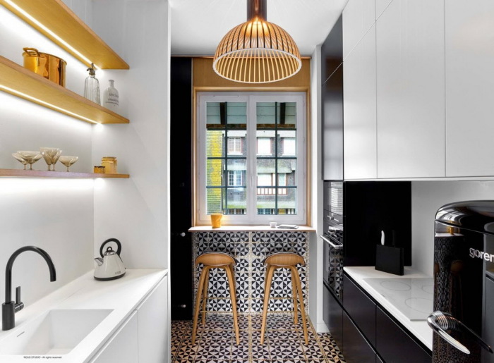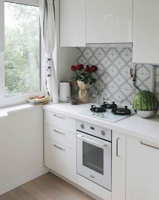 Важнейшим моментом является оформление окна. Окно — ключевая точка на такой кухне. Оно должно быть свободно, открыто, чтобы впускать свет и простор в интерьер, который страдает от их нехватки.