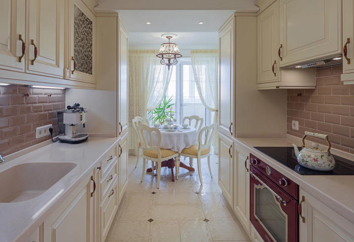 Длинная и узкая кухня может казаться больше и просторнее, если вы добавите зеркальную отделку, покрасите стены в белый, не будете вешать массивные толстые шторы, поставите белые окна и двери. Это визуально облегчит пространство.
