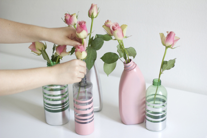 Стеклянные бутылки — отличный материал для изготовления необычной вазы. /Фото: refashionnation.files.wordpress.comЛюбые прозрачные бутылки с разными оттенками могут стать интересным элементом декора. Их можно использовать просто сняв этикетку, либо немного украсив. Для декора используются разные методы, например, атласные ленточки или бусины, которые наклеиваются с помощью клеевого пистолета, акриловые или другие краски для росписи, декоративная бумага, кружева, джутовая веревка и т.д. Сделать вазу более эффектной поможет срез на верхней части бутылки.