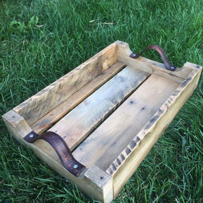 Из обычного деревянного ящика получается отличный вместительный поднос. /Фото: i.pinimg.comСейчас в моду вошли подносы, которые довольно таки сильно похожи на разделочные доски, либо имеют небрежный стиль. Создать такие без труда можно даже самостоятельно. Для этой цели подойдет ненужный деревянный ящик или доска, к которым потребуется прикрепить ручки. Роль ручек могут сыграть прочные толстые веревки, кусочки старого ремня, закрепленного с помощью саморезов, мебельная гарнитура или другие подходящие элементы. Дерево можно покрасить в один или несколько цветов, покрыть лаком или искусственно состарить, подчеркнув фактуру.