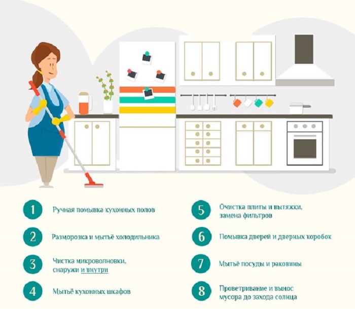 Составьте план уборки, чтобы на кухне всегда был порядок. / Фото: home-gid.comВ конце недели можно отдохнуть и насладиться результатами проделанной работы. Чтобы порядок на кухне сохранялся как можно дольше, составьте для всех членов семьи расписание уборки и расхламления. Если вы его будете придерживаться, то комната всегда будет выглядеть идеально, как в этот день.Также возьмите на вооружение 8 дизайнерских подсказок, как сократить расходы на ремонте кухни