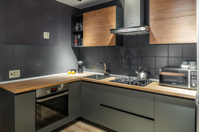 Правда, эталонная кухня — это все-таки черный + красный акцент, много мелких черных деталей, серые вкрапления. Иногда используется дополнительно белый цвет. Отталкиваться стоит от идеального кухонного гарнитура, который вы найдете, а не от материалов отделки. Так вам будет проще подобрать идеальную цветовую гамму и найти нужные цветовые акценты.В отделке популярны материалы под камень, бетон и дерево. При этом это могут быть самые различные варианты — например, плитка для фартука под камень, столешница под бетон, потолок с деревянными балками, керамический паркет на полу и т.п.