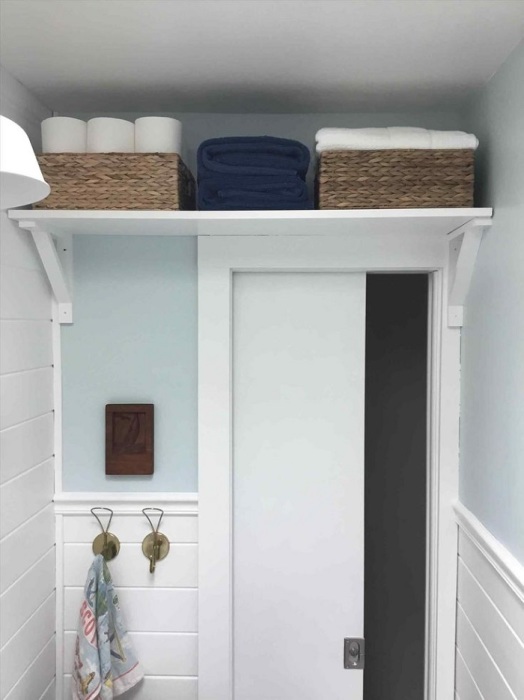 На полку над дверью можно поставить корзинки с бытовой химией. / Фото: kaiser36.ruСамым простым и бюджетным вариантом системы хранения является полочка. Если не знаете, где ее разместить, обратите внимание на пространство над дверью, о котором всегда несправедливо забывают. Чтобы полочка была максимально незаметной и сливалась с имеющейся обстановкой, подберите цвет в тон стен и постарайтесь ее сделать не плоской, а глубокой, как бабушкины антресоли. Что можно здесь хранить? Самый оптимальный вариант – плетеная корзинка с бытовой химией. Такое решение обязательно оценят семьи, в которых есть дети. Маленькие исследователи частенько заглядывают в ванную и пытаются попробовать на вкус все, что попадется под руку. А до такой полочки они точно не смогут дотянуться.