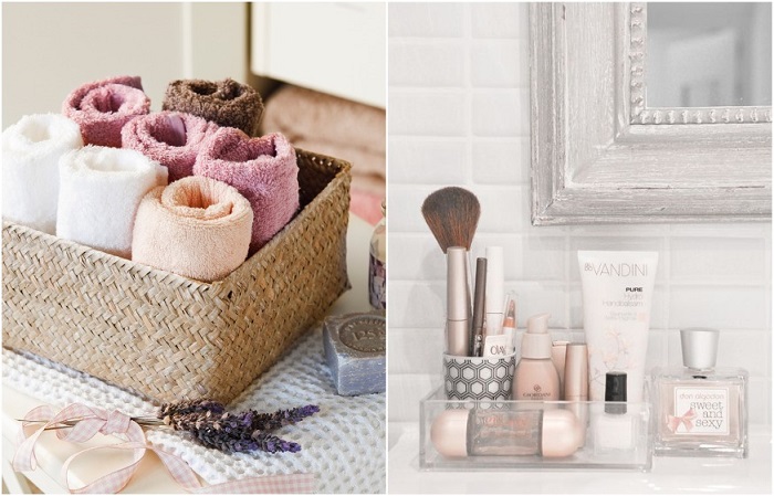 Вертикально можно хранить полотенца, косметикуПринцип вертикального хранения стал популярным несколько лет назад и до сих пор не сдает свои позиции. Впервые им воспользовалась японка Мари Кондо, специалист по наведению порядка в доме, автор книги «Магическая уборка». Главная идея заключается в следующем: в ванной нужно оставить только нужные вам вещи, свернуть их в компактные прямоугольники или ролики, разложить по цветам и категориям, а затем хранить вертикально. От предметов, которые вы уже давно не используете, нужно отказаться, а аргументы по типу «это память» здесь не сработают. Поверьте, прекрасные воспоминания об отдыхе в Сочи не исчезнут, если вы расстанетесь с мыльницей, которую привезли оттуда.Обратите внимание: Вертикальную систему хранения можно реализовать при помощи установки на дверь двух штанг параллельно друг другу, и сложить между ними свернутые в ролики полотенца.