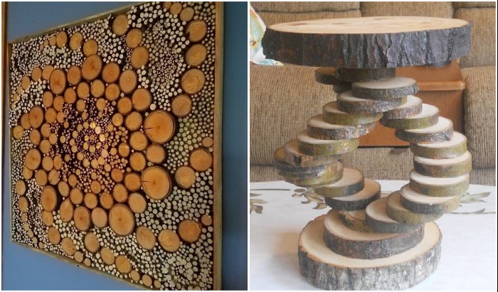 Дерево всегда было, есть и будет самым универсальным и прекрасным материалом для оформления интерьеров. Даже в роскошных современных особняках изделия из дерева, причем из разных его частей, вплоть до обычных срезов, смотрятся стильно, оригинально и душевно. Единственное, что при использовании натурального материала нужно знать тонкости заготовки, обработки и его хранения, чтобы готовый шедевр прослужил долго и радовал глаз.1. Постепенное возвращение к истокам Спилы дерева в современном интерьере. | Фото: studio-mint.ru.Современный человек настолько пресытился и даже устал от урбанистической красоты мегаполисов, что стремится если не вернуться к природным истокам, то хотя бы окружить себя чем-то натуральным. И неважно, будут это органические продукты питания, мебель, личные вещи или косметика, созданные из натуральных материалов. И это не говоря об экологических интерьерах, ставшими новым трендом в современном дизайне. Обычные подставки под горячее станут элегантным украшением стола. | Фото: roomble.com.При этом не надо быть большим приверженцем эко-стиля, чтобы заметить красоту натурального дерева, даже если это будет обычный спил (срез, плашка) и загореться идеей создать в своем доме необыкновенно интересный и душевный дизайн. И, чтобы преуспеть в этом деле нужно иметь огромное желание, творческую натуру, а также знать тонкости выбора и подготовки древесины к обработке и работе с ней.2. Породы древесины, используемые в оформлении, и их основные характеристики Милые безделицы из спилов древесины привнесут в спальню особую атмосферу тепла и уюта. | Фото: roomble.com.Внешний вид спилов в оформлении интерьеров или в ландшафтном дизайне имеет первостепенное значение, поэтому вопросу подбора материала следует уделить особое внимание. Срезы основных лиственных пород деревьев. | Фото: pikabu.ru. Так выглядят срезы хвойных деревьев, распространенных на территории России. | Фото: pikabu.ru.Поскольку большинство жителей страны не является технологами деревообрабатывающей промышленности и представление не имеет о свойствах, фактуре, оттенках и рисунках на срезах основных пород деревьев, то перед созданием дизайна стоит узнать:- сосна имеет отчетливый рисунок, но практически лишена текстуры. При высыхании срезы имеют свойство растрескиваться (даже при точном соблюдении всех технологий);- дуб будет всегда с красивым срезом, в котором сочетается сразу несколько цветовых оттенков и с нестандартной геометрией. Древесина дуба отличается особой крепостью, прочностью и плотностью, хотя эти свойства зависят от места произрастания. Плашки не склонны к появлению трещин;- липа имеет вязкую структуру без видимого рисунка волокон, легко поддается обработке и резке, мягкая и легкая. Плашки не подвержены растрескиванию и хорошо тонируются морилкой;- ольха имеет такую же структуру, как и липа. Отличительной чертой является лишь оранжевый подтон и выраженная текстура волокон. Спилы не подвержены растрескиванию;- береза всегда будет с плотной древесиной. Хорошо полируется, после чего приобретает интересный вид. Растрескивается в редких случаях, плюсом является и то, что можно найти материал с нестандартной геометрией;- клен с жесткой и плотной древесиной, легко поддается обработке, но распил будет проблематичным. Имеет отчетливую фактуру волокон, которую легко усил