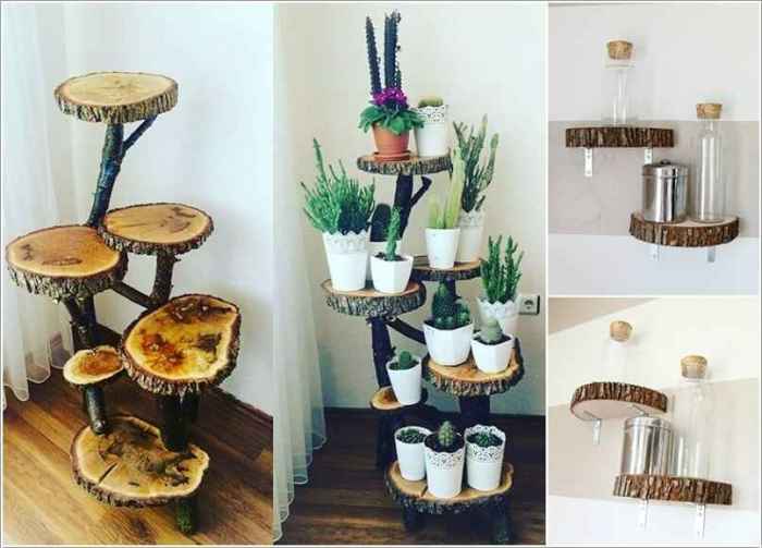 Из деревянных плашек большого диаметра и достаточной толщины можно сделать оригинальные подставки под цветы или мини-полочки. | Фото: doka-master.ru.