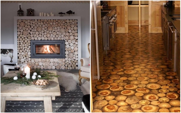 Из деревянных срезов можно сделать акцентную стену и даже фантастической красоты полы. | Фото: m-strana.ru/ drevologia.ru.В том случае, когда дом или квартира оформлены в деревенском стиле или стиле кантри, то со срезов дерева смело можно делать полы в одной из комнат, облицевать стены (как внутренние, так и наружные), сделать оригинальную акцентную стену или перегородку, использовать для зонирования.