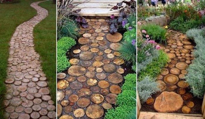 Из спилов дерева можно сделать оригинальные садовые дорожки и даже замостить двор. | Фото: blogforbuilder.ru/ ogorod.ru.Несмотря на то, что спилы деревьев любой породы подвержены гниению и деформации во время намокания, их все равно активно используют в ландшафтном дизайне. Только в этом случае деревянные элементы пропитывают специальным составом, который предохраняет древесину от негативных факторов, связанных с климатическими и погодными условиями.