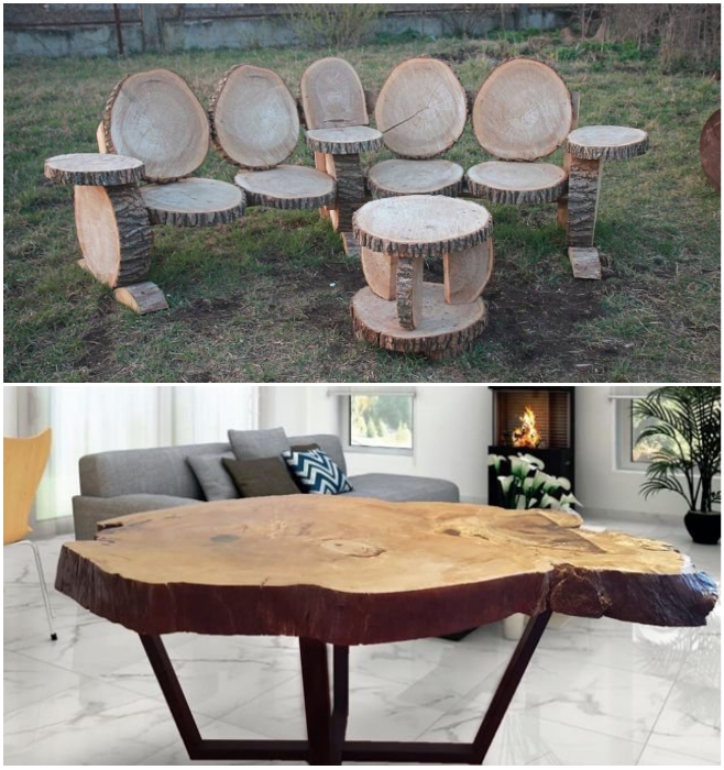 Мебель из массивных спилов одинаково хорошо смотрится и на дачном участке, и в современной квартире. | Фото: avito.ru/ maja-dacha.ru.Поскольку красота спилов дерева состоит не только в цвете и рисунке, но и форме самого «кругляша», из них можно создавать невероятное количество вариаций декора, начиная от забора по всему периметру и оригинальных дорожек, ведущих в сад, на детскую площадку/ в зону барбекю и заканчивая садовой мебелью, различными полезными вещицами в виде горшков под цветы, полочками, вазонами и очаровательными поделками.Любой интерьер можно «оживить» с помощью натурального дерева. Для того чтобы решиться на нестандартные преобразования и создать дизайн собственными руками без особых капиталовложений, нужно знать некоторые хитрости и основные правила.