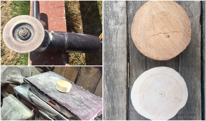 Нарезка спилов и их шлифовка очень трудоемкая и пыльная работа. | Фото: kvartblog.ru.Самый простой и быстрый способ обзавестись оригинальным материалом для декора – это приобрести спилы в специализированных магазинах или на складах. В том случае, если вы все же решили сами заняться нарезкой выбранного материала, то нужно знать, что свежеспиленные бревна для этих целей не подойдут. Ни в коем случае нельзя нарезать свежее дерево на плашки, а потом его сушить – это приведет лишь к растрескиванию и потере формы. Распил производится только после правильной сушки дерева, что в домашних условиях сделать проблематично. В этом случае авторы Novate.ru рекомендуют приобретать уже сухой материал и с ним работать.