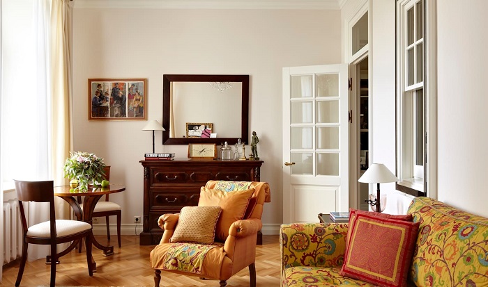 Акцентом может стать как подушка, так и целый диван. / Фото: pinterest.ruПосле того, как вы вместе с друзьями дружно покрасили стены, нужно определиться, с помощью каких деталей будете оживлять интерьер. Здесь очень важно не переборщить. Белый цвет хоть и является отличным фоном, но не для десяти цветов сразу. Чтобы не получился винегрет, стоит заранее определиться с акцентами. Сразу изучите гармоничные комбинации оттенков: например, бежевый сочетается с красным, и изумрудным, серый – с фиолетовым, розовым, темно-коричневый – с лимонно-желтым, голубым и так далее. Кроме того, полезно будет развивать «насмотренность»: в Instagram и Pinterest просматривайте и сохраняйте фото интерьеров, анализируйте их, запоминайте понравившиеся детали, чтобы впоследствии использовать их при оформлении своей квартиры.Акцент можно сделать на что-угодно, например, на винтаж. Подходящую мебель и аксессуары можно найти на барахолках или в бабушкиных закромах. Для интерьера подойдут теплые оранжевые тона, деревянная мебель, персиковые шторы. В качестве акцентов можно использовать изумрудные кресла и оригинальные торшеры. Такая квартира будет выглядеть очень уютно и интересно.