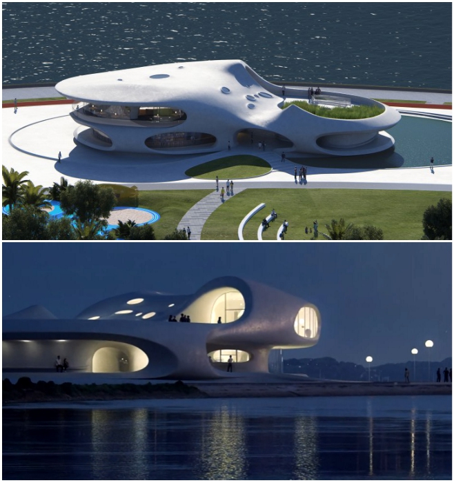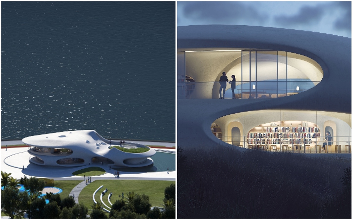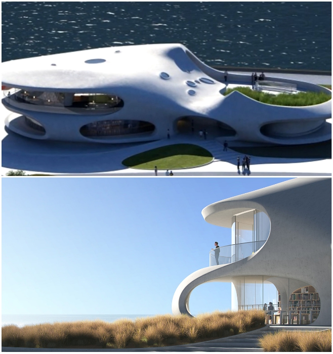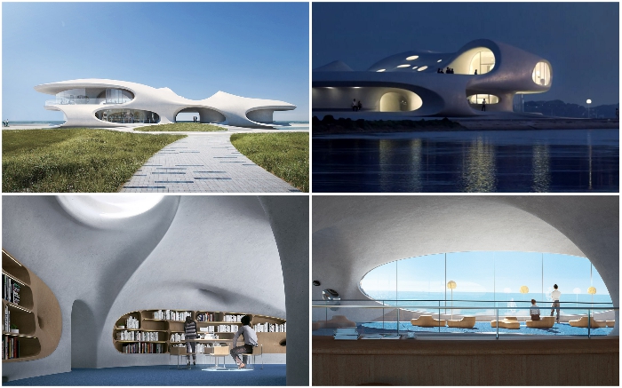 В 2019 г. власти провинции Хайнань (Китай) инициировали реконструкцию части острова Хайкоу, чтобы обновить и усовершенствовать использование общественных пространств вдоль береговой линии. Среди первых объектов, которые планируют сдать уже в 2021 году, будет фантастическая библиотека «Wormhole Library», поражающая изогнутыми формами, «выходящими за пределы времени и пространства». Здание возводится с использованием особой технологии бесшовной отливки белого бетона, вследствие чего получится монолитная структура без единого угла и отверстиями в виде «червоточин» вместо окон. Концепт библиотеки «Wormhole Library», Хайкоу. | Фото: worldarchitecture.org/ newatlas.com, © MAD Architects.На берегу Южно-Китайского моря полным ходом идет строительство новой библиотеки, которая больше напоминает странный инопланетный объект, воплощаемый «безумными» архитекторами. Работы ведутся в соответствии с утвержденным властями провинции Хайнань (Китай) планом реконструкции части острова Хайкоу (в одноименном городе) и Парка Столетия, находящихся прямо у береговой линии. Библиотека «Wormhole» займет одно из главных мест в создании обновленных общественных мест на набережной Хайкоу (концепт, Китай). | Фото: archynaija.wordpress.com/ © MAD Architects.Это место пытаются превратить в территорию социального взаимодействия горожан, а библиотека станет многофункциональным комплексом, в котором можно будет почитать, наслаждаться видами бескрайнего моря, пообщаться с единомышленниками, посещать культурные мероприятия под открытым небом. «Wormhole Library» будет выполнять функцию многофункционального культурного центра города Хайкоу (концепт, Китай). | Фото: newatlas.com/ © MAD Architects.Несмотря на то, что возводится сразу несколько новых объектов, библиотеку, получившую нестандартное название «Wormhole Library» («червоточина»), планируют закончить к 2021 г. первой. Пекинская архитектурная студия MAD Architects, которая и разработала «пористую структуру», больше похожую на головку швейцарского сыра с большими дырками или ходами-норами крота, подчеркивает, что ее конструкция «выходит за пределы времени и пространства». И это действительно так. Бесшовную оболочку павильона отливают из белого бетона и с помощью ультрасовременной техники (концепт «Wormhole Library», Хайкоу). | Фото: archynaija.wordpress.com/ © MAD Architects.По сведениям редакции Novate.ru, для того чтобы отливать бетонные детали обтекаемой формы внешней бесшовной оболочки, разработчикам пришлось прибегнуть к помощи станков с ЧПУ и технологии 3D-печати. Благодаря этому получается монолитная конструкция с плавными футуристическими линиями с уже сформированными округлыми окнами разного размера и формы, дверными проемами, балконами и террасами. Читальные залы займут львиную долю внутреннего пространства «Wormhole Library» (концепт, Китай). | Фото: worldarchitecture.org/ © MAD Architects.Интересный факт: Для того чтобы наверняка убедиться в том, что нестандартный проект жизнеспособен и в реальности получится создать цельную оболочку фасада, авторам проекта пришлось делать полномасштабный макет (мокап). Хотя сооружение «Wormhole Library» имеет совсем немаленькую площадь – 1380 кв. м! Попасть в зоны отдыха, расположенные со стороны залива можно как изнутри помещения, так и по наружным коридорам (концепт «Wormhole Library», Хайкоу). | Фото: archynaija.wordpress.com/ © MAD Architects.«Эта тщательно подобранная структура отлита из белого бетона как единое целое. Изогн