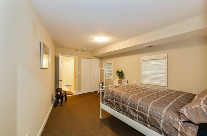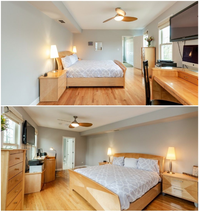 Эта спальная комната может быть и детской, и гостевой («Pie house», Дирфилд). | Фото: realtor.com/ © Alan Berlow.В доме оформлено две спальных комнаты, в одной из которых также преобладают бело-серые тона отделки стен и натуральное дерево в качестве напольного покрытия и мебельных гарнитуров. Такую скромность разбавляют лишь дизайнерские светильники с вкраплениями золотых элементов. А вот во второй спальне, все еще более минималистично – кровать с изящным металлическим изголовьем и изножьем, небольшая тумба и статуэтка пса.