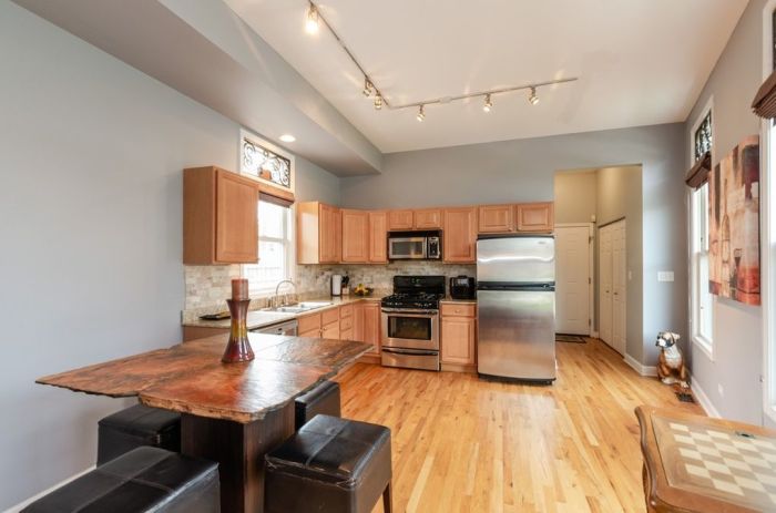 Столовая зона расположена между кухней и гостиной («Pie house», Дирфилд). | Фото: realtor.com/ © Alan Berlow.Кухня-столовая находится сразу за гостиной и никакими перегородками не отделена, чтобы не замыкать пространство и не ограничивать объем этих зон. Кухня оборудована по последнему слову техники, а в качестве основного материала для создания гарнитура и столовой мебели, было выбрано натуральное дерево.