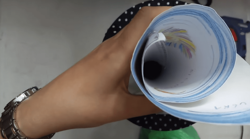 Лампа практически готова, но вес еще слишком мал. В таком состоянии она не будет устойчивой. Чтобы утяжелить конструкцию заполняем низ лампы мелкими камешками через бумажную воронку, но не до самого верха.