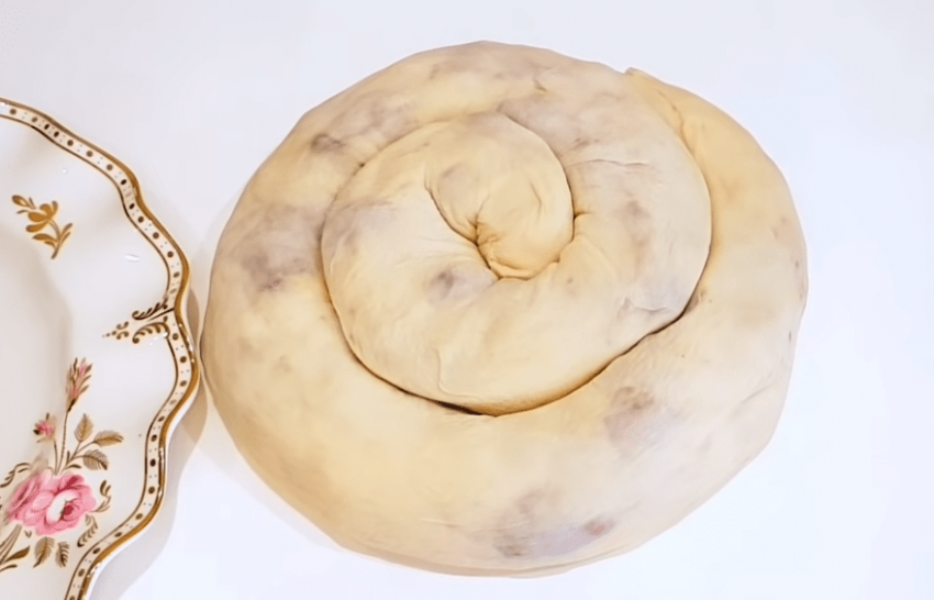 Слегка припылив заготовку мукой, раскатываем ее скалкой, чтобы получить лепешку. Поверхность обильно смазываем яичным желтком и отправляем в духовку.