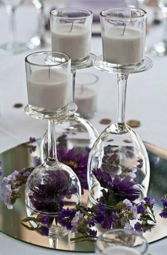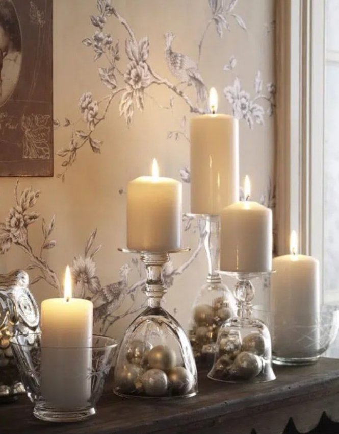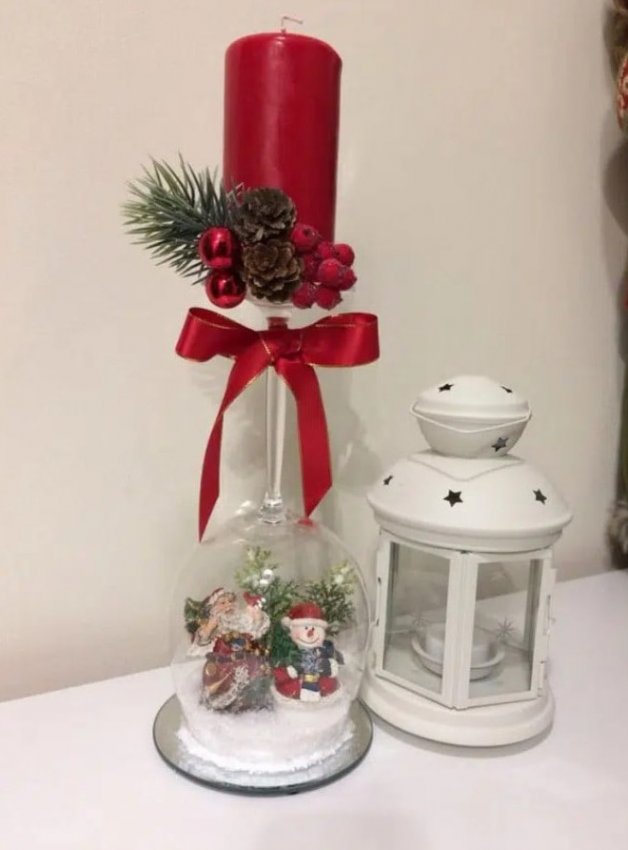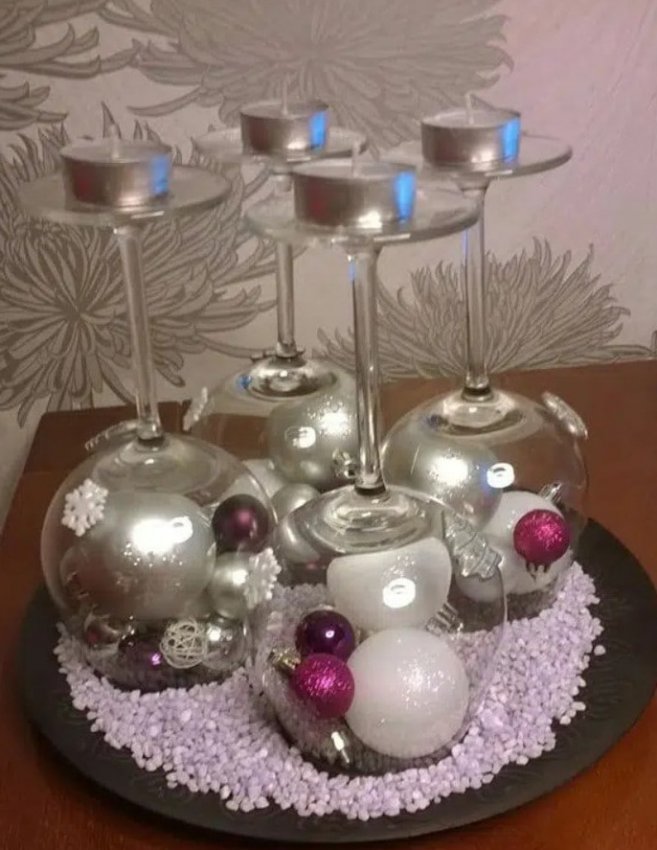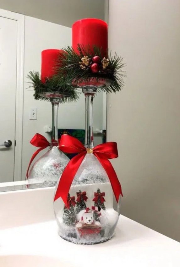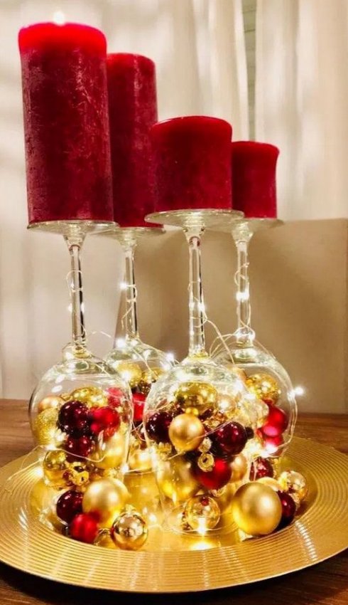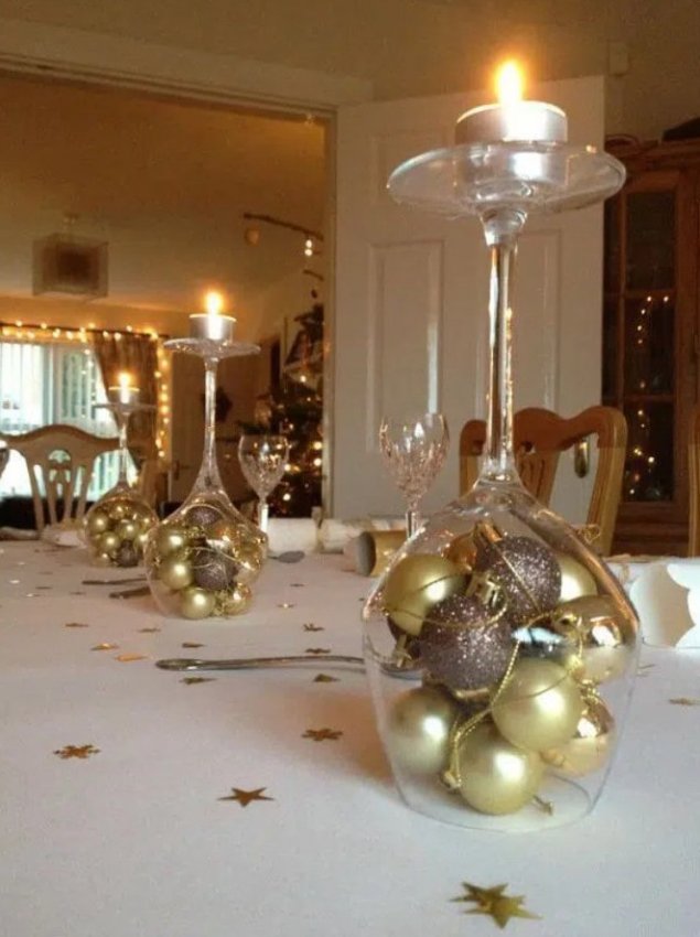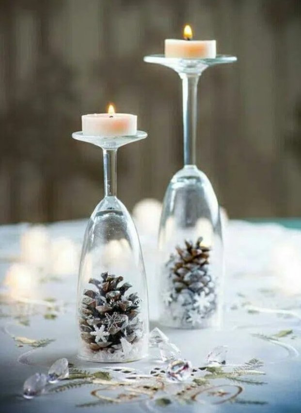 Необязательно тратить много времени и сил на создание красивого новогоднего декора. Немного фантазии и украшения получится сделать из самых неожиданных вещей, например из бокалов для вина. Для того чтобы сделать декор в бокалах понадобится буквально несколько минут и пара новогодних игрушек, свечей, шишек. Просто поместите в бокалы несколько декоративных элементов, и результат будет потрясающим! Оригинально и очень празднично смотрятся перевернутые бокалы, на ножку которых ставится свеча. А если у вас есть желание творить, то вы можете покрыть бокалы краской и создать в них имитацию снега.