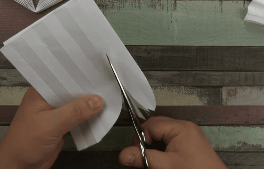 Теперь вырезаем будущие лучики. Это можно делать «наживо» или по нанесенной карандашом разметке. Между метками находится по одному лучику. Каждый лучик разделен вдоль пополам линией сгиба. Задача заключается в том, чтобы округлить верхушку каждого лучика, а затем, дойдя до метки, развернуться и перейти к формированию следующего, находящегося ниже.